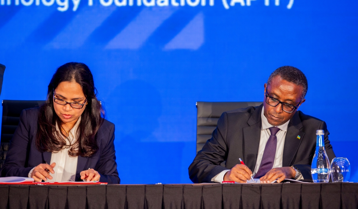 Dr Vincent Biruta, Minister of Foreign Affairs and Prof. P.G. Sampath of the Africa Pharmaceutical Technology Foundation (APTF), sign the Host Country Agreement between Rwanda and APTF in Kigali on Monday, December 18. Courtesy