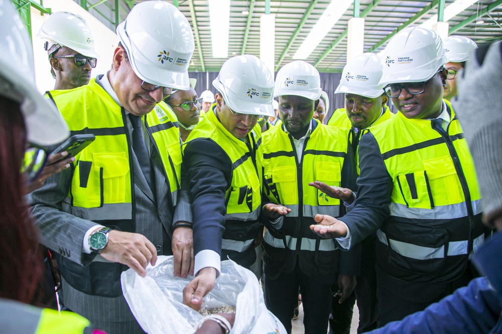 (L-R): CEO of OCP Africa, Mohamed Anouar Jamali, Managing Director of Rwanda Fertilizer Company (RFC), Anass Khanchoufi, Minister of Agriculture and Animal Resources, Ildephonse Musafiri, Director General of Agriculture Modernisation at MINAGRI, Patrick Karangwa, and Minister of Trade and Industry, Jean-Chrysostome Ngabitsinze observe fertiliser samples during the official launch of the Rwanda Fertilizer Blending Plant in Bugesera District on December 20, 2023.The newly launched factory has an annual capacity to blend 100,000 tonnes of fertilisers.
