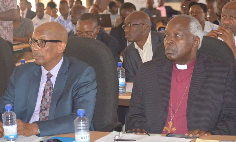 Dr. Innocent Mugisha, HEC Executive Director (left) with Bishop Onesphore Rwaje, the president of ORIPES during the meeting (Steven Muvunyi).
