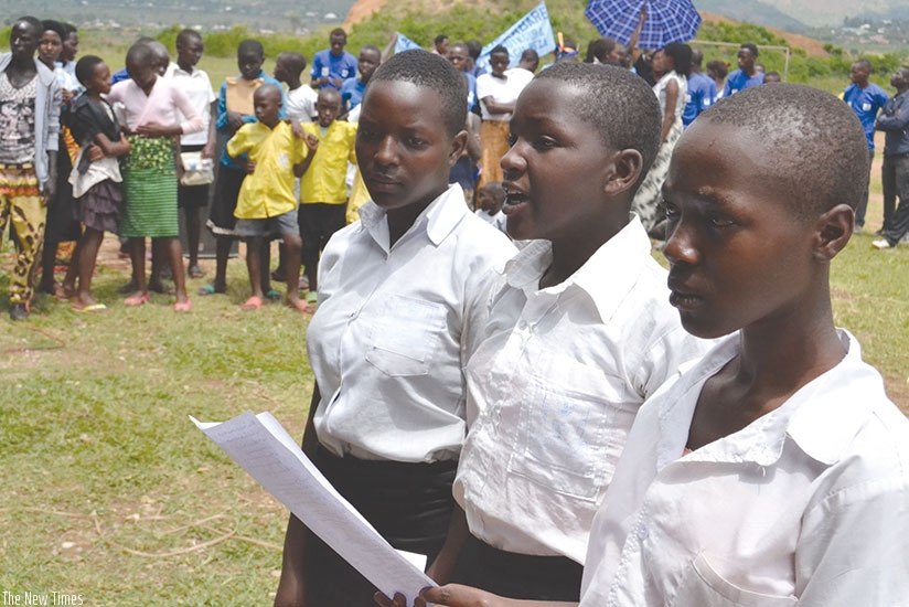 Girls recite a poem during the International Day of the Girl Child celebrations in Kayonza District on Friday. / Stephen Rwembeho.