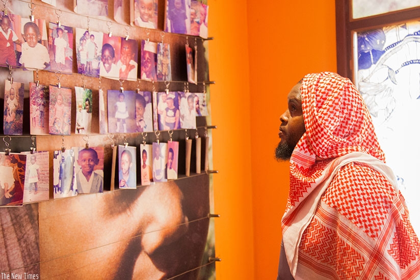 A visitor observes some pictures of kids killed in the 1994 Genocide against Tutsi. (Nadege Imbabazi)