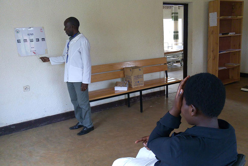 A nurse testing a patient's eye sight during a village outreach visit in Gatenga Sector, Kicukiro District. / Courtesy