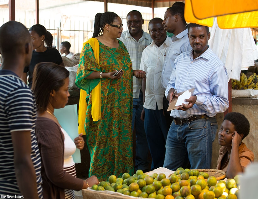 MP Mukazibera (C) speaks to some of the leaders of Gahanga market during the legislators’ tour of Kicukiro District last week. (Timothy Kisambira)