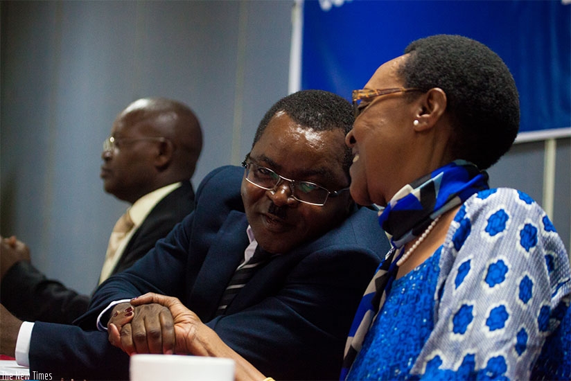 Munyeshaka (L) and Ingabire exchange greetings during the launch of the report in Kigali yesterday. (Photos by Timothy Kisambira)