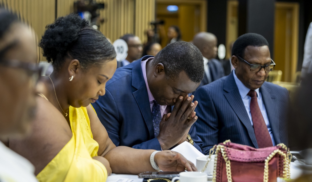 Apostle Paul Gitwaza, the senior pastor at Zion Temple (C), and Dodo Twahirwa, CEO of Jali Transport (R) during the 29th annual National Prayer Breakfast at Kigali Convention Centre on Sunday, January 14.The annual event brought together government officials, private sector leaders, diplomats, and senior religious leaders, among others. All photos by Olivier Mugwiza