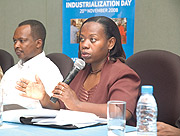 Commerce Minister, Monique Nsanzabaganwa stresses a point while Mines and Natural Resource MinisterVincent Karega listens (Photo/ G.Barya)
