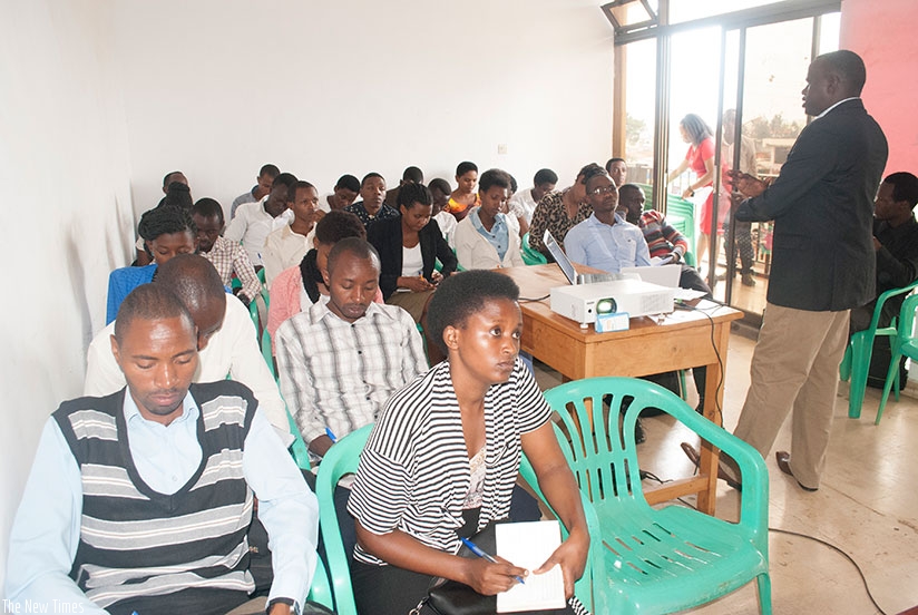 Faustin Mutabazi, the chief executive officer of Education Consultancy Bureau addresses the trainees. BELOW: Trainees follow proceedings during the one-day training in Remera, Kiga....