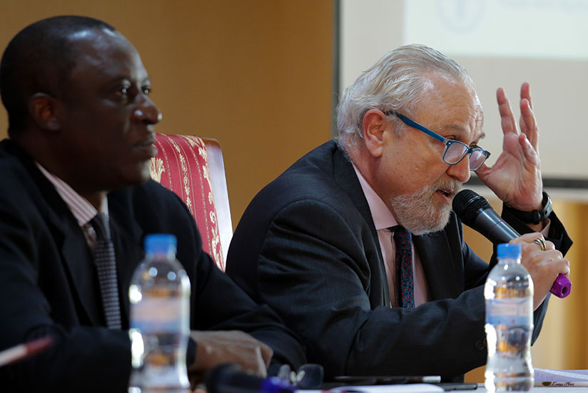 Dr. Cezar Alvarez Santos Senior IT FAO Rome and Technical Lead of the Project speaks at the meeting as FAO Representative in Rwanda, Attaher Maiga (L) looks on. / Timothy Kisambira
