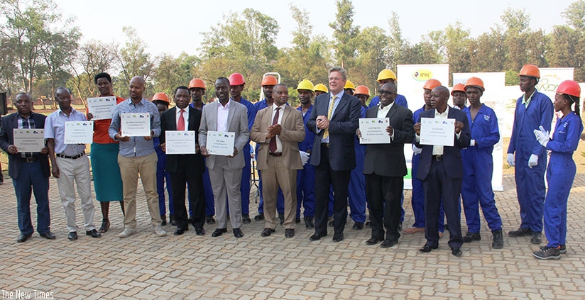 Rwamukwaya (6th Left) and Amb. Dr. Woeste (3rd Right), construction companies' managers and apprentices pose for a group photo after the event. (Courtesy)