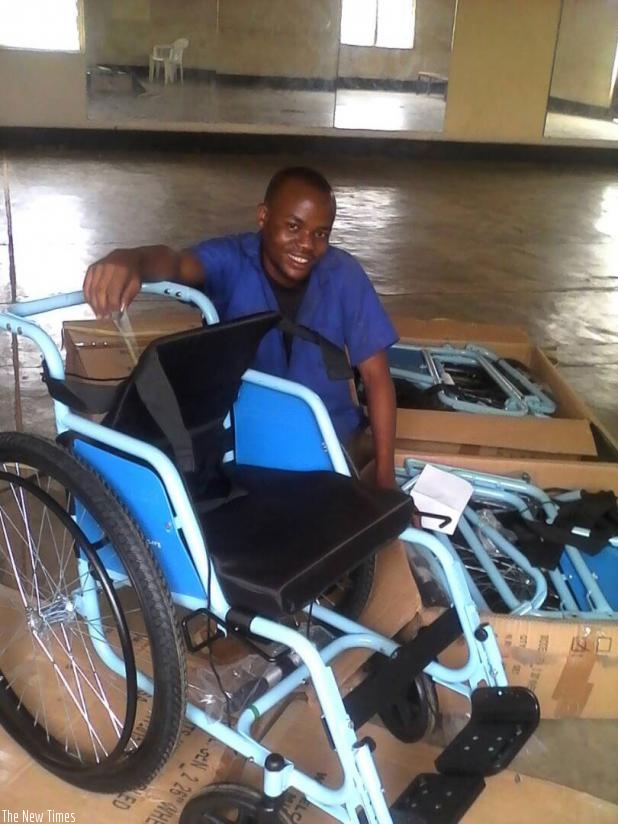 Habanabakize poses by a wheelchair he is making. / Jean d'Amour Mbonyinshuti