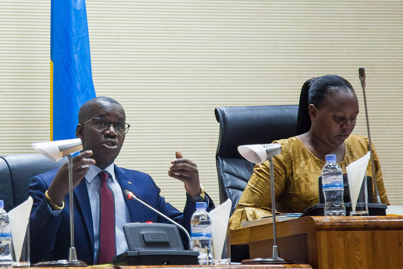 State Minister for Constitutional and Legal Affairs, Evode Uwizeyimana, tables the Bill that seeks the amendment of the Penal Code before Parliament as Deputy Speaker of the Lower ....