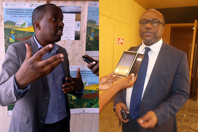 RAB's head of Research Division, Dr. Patrick Karangwa (left), and Kent Nnadozie say it is important for countries to work together to find solutions to diseases and drought affecti....