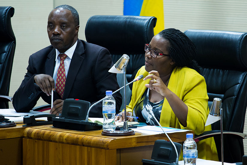 Mukeshimana speaks as MP Gabriel Semasaka, the deputy chairperson of the parliamentary Standing Committee on Agriculture, Livestock and Environment, looks on. / Timothy Kisambira