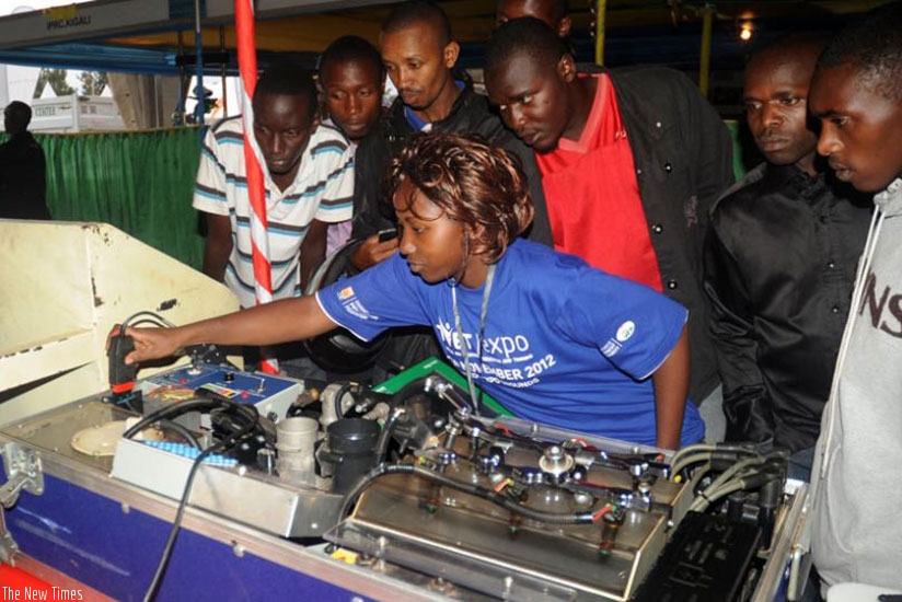 A student of mechanics explains how an engine works during a TVET expo in Kigali. (File)