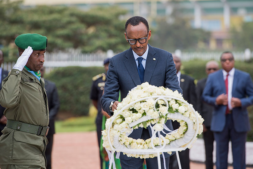 President Kagame lays a wreath to honour heroes at the National Heroes' Mausoleum yesterday. / Village Urugwiro