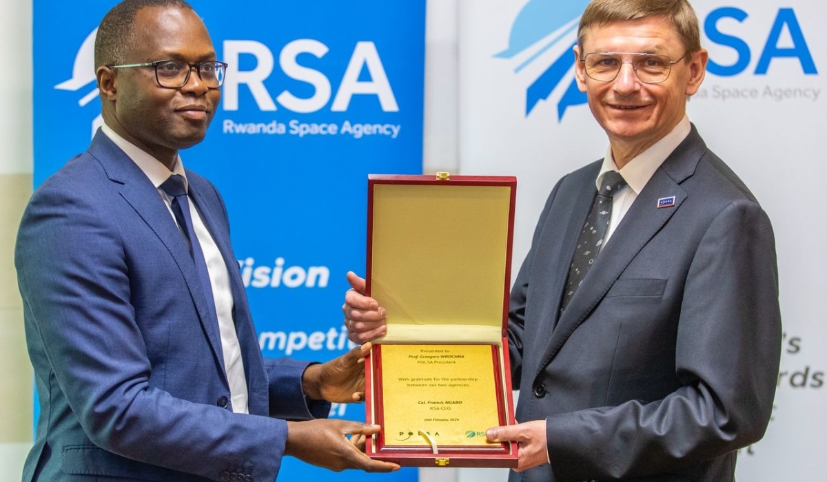 Col Francis Ngabo, CEO of Rwanda Space Agency (RSA) and Grzegorz Wrochna, President of POLSA at the signing of MoU that seeks to advance and explore bilateral collaboration opportunities in space technology. COURTESY PHOTO