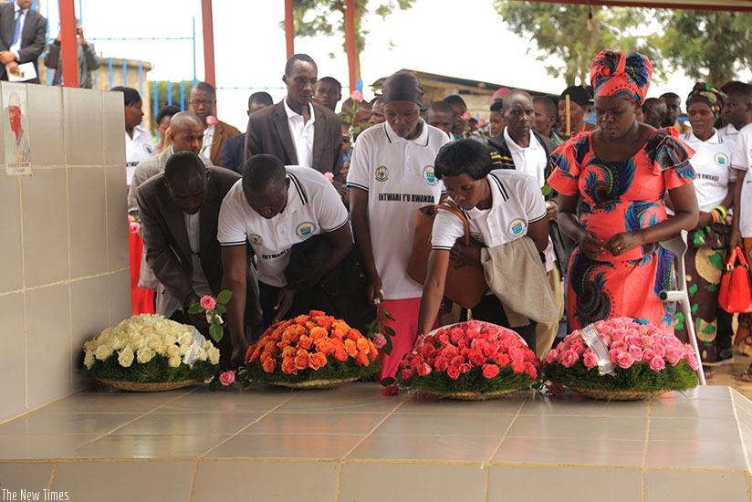 Survivors of the March 18, 1997 nighttime attack on ES Nyange school in Ngororero District lay wreaths on the grave of one of their former classmates, Valens Ndemeye, who was kille....