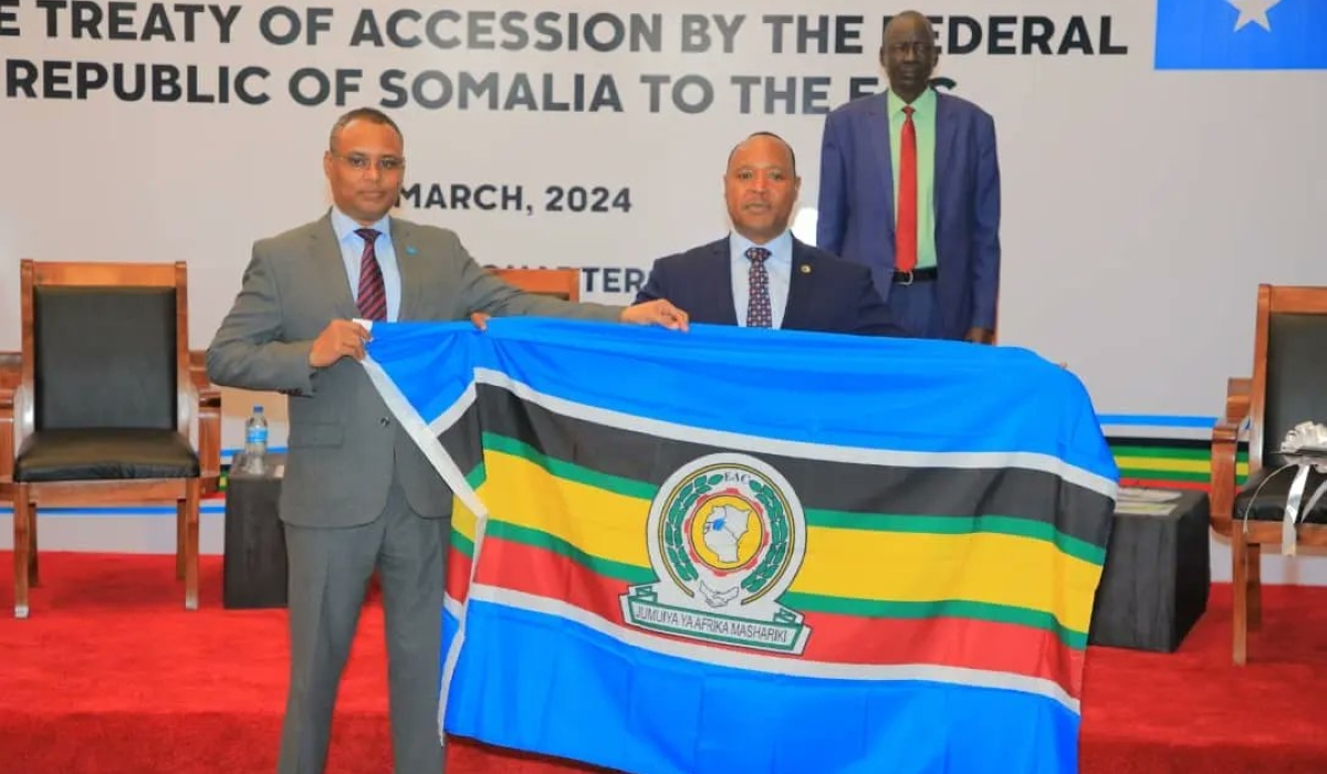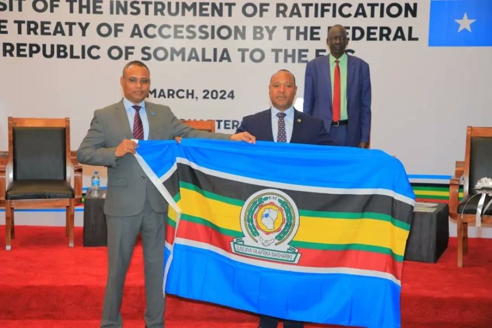 Somalia is now a full member of the East African Community (EAC), after depositing her instrument of ratification of the Treaty of Accession to the regional bloc, the EAC Secretariat announced on March 4. The country submitted the instrument of ratification with the EAC Secretary General, as provided for by the EAC Treaty. The move makes the Horn of Africa country the bloc’s eighth Partner State – other Partner States being Burundi, the DR Congo, Kenya, Rwanda, South Sudan, Uganda, and Tanzania. ALSO READ: Somalia joins East African Community Speaking at the event held in Arusha, Tanzania, Somalia’s Minister of Commerce and Industry, Jibril Abdirashid Haji, said this momentous occasion makes a significant step forward in Somalia’s journey towards this great regional integration and cooperation. “Through increasing trade, bilateral agreements, and joint programmes and projects, Somalia aims to play an active role in the growth and prosperity of the East African region,” he said. “We are committed to participating in initiatives that promote sustainable development, job creation, and improved livelihoods for our citizens, and all members of this esteemed community respectively,” he said. “As we deposit this instrument of ratification today, let it symbolise not just a signature on paper, but a promise of dedication and cooperation. Somalia is ready to embrace its role as a contributing member of the East African Community, working hand in hand with each of you towards this brighter, more prosperous future for all East African member states and its citizens,” he observed. Federal Republic of Somalia is now officially a full member of the East African Community after depositing her Instrument of Ratification with the Secretary General of the East African Community at the EAC Headquarters in Arusha, Tanzania @TheVillaSomalia @pmathuki pic.twitter.com/8BDh2pmpOz — East African Community (@jumuiya) March 4, 2024 EAC Secretary General Peter Mathuki said the depositing of the instrument of ratification marks the start of the EAC integration work for Somalia, observing that joining the community has a lot of benefits. “The community now expands to eight Partner States, with a population closer to 350 million people. That’s a huge market. With its longest coastline now, Somalia brings on board 3,300 kilometres of the coastline, and that is a serious economic implication in terms of the cost of transport of goods coming from East Africa to the rest of the world, and goods coming from the rest of the world to East Africa. I think we need to harness that,” he said, citing the development of relevant infrastructure. With the development, he said that EAC is “a huge market and I am sure now we stand competitive with the rest of the world in terms of how we engage.”