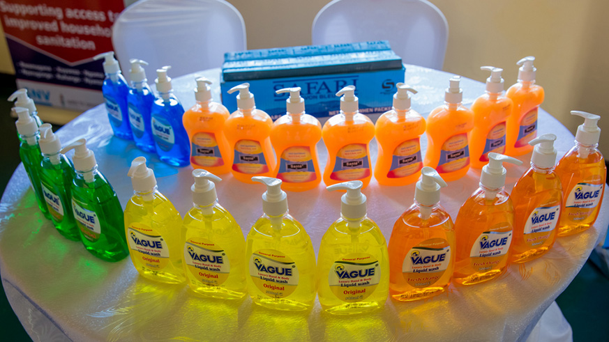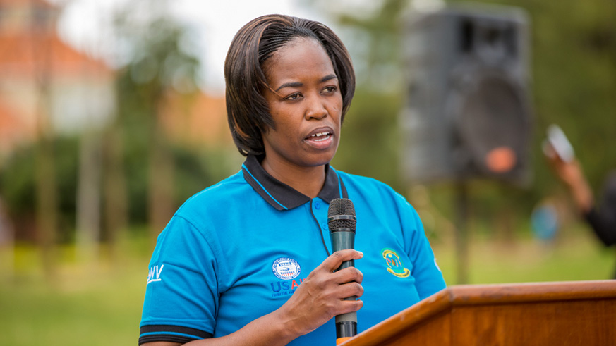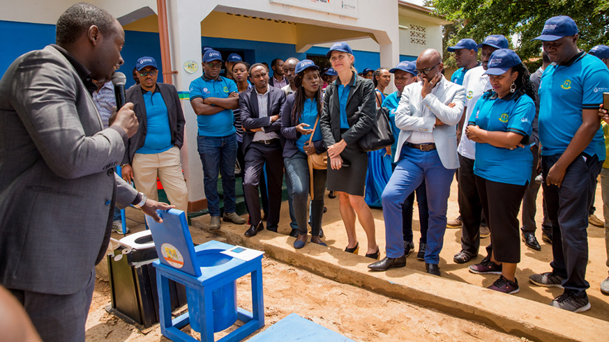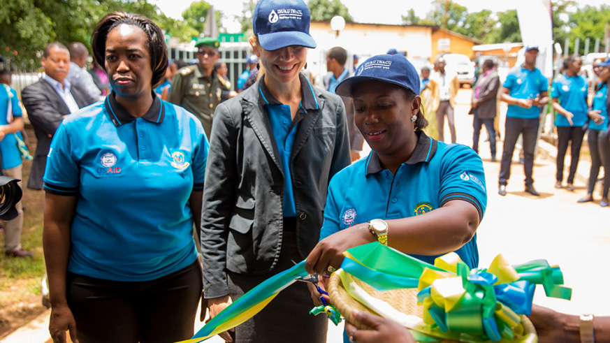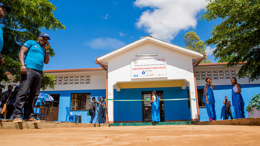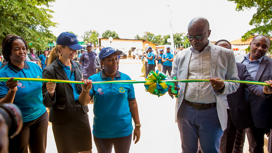 Sheikh Hassan Bahame, Director General in charge of social affairs and community development at the Ministry of Local Governmen cuts the ribbon at the inauguration of Rwamagana District Sanitation Centre. Looking on are (right to left) Jeanne Umutoni, Vice Mayor of Rwamagana District in charge of social affairs; Leslie Marbury, USAID Acting Mission Director; and Phomolo Maphosa, SNV Rwanda Country Director. All photos/Courtesy.