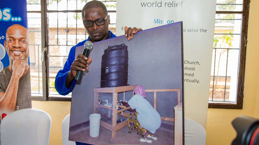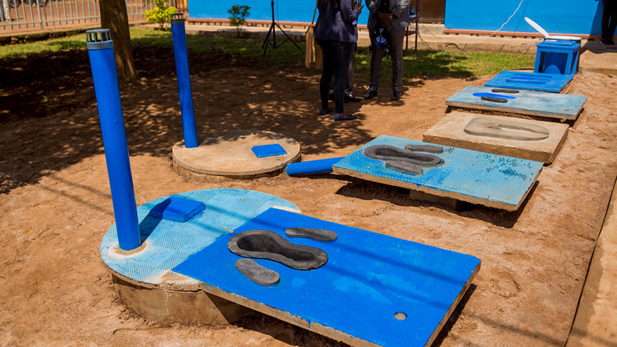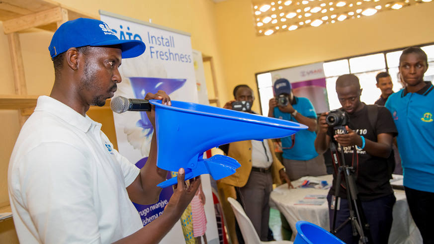 Emmanuel Tuyisenge, Managing Director of TEMACO Builders, shows guests various locally available latrine technologies, including latrines designed for people with disabilities.