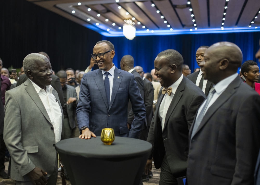 President Paul Kagame shares a light moment with Samuel Mugisha, his former teacher at Ntare School, Apollo Kashanku, the chairman of Ntare School Old Boys Association (NSOBA), and current Ntare School Headmaster Saul Rwampororo, during a cocktail at Kigali Convention Centre on Friday, March 8. Mugisha, Kashanku, Rwampororo, and over 500 members of Ntare School alumni earlier travelled to Kigali for the finals of the Ntare Lions League (NLL) football tournament, from March 7 to 10.