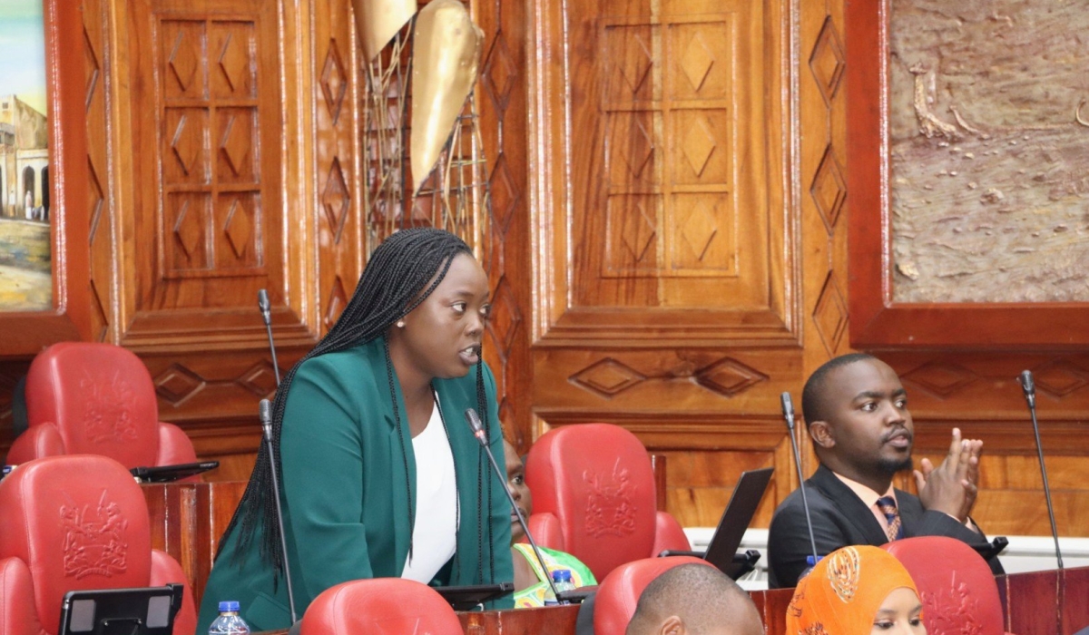 MP Alodie Iradukunda (standing) moves the motion for the recognition of EALA Youth Caucus as a forum for members of the assembly to promote the full participation of youth in programmes and activities of the East African Community, on March 13, 2024, in Nairobi, Kenya (courtesy).