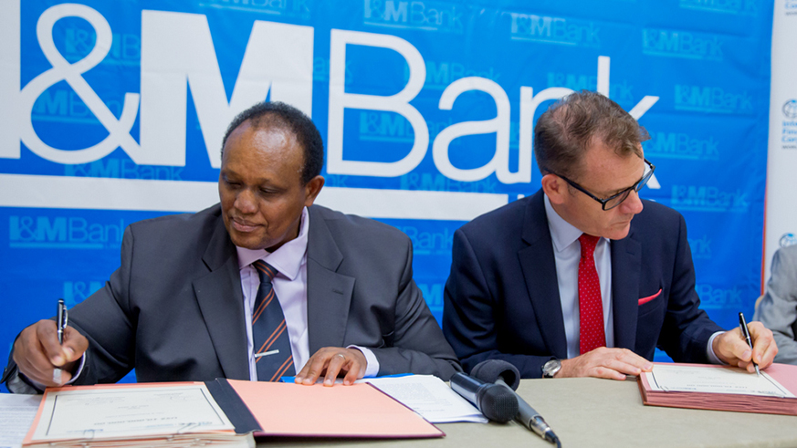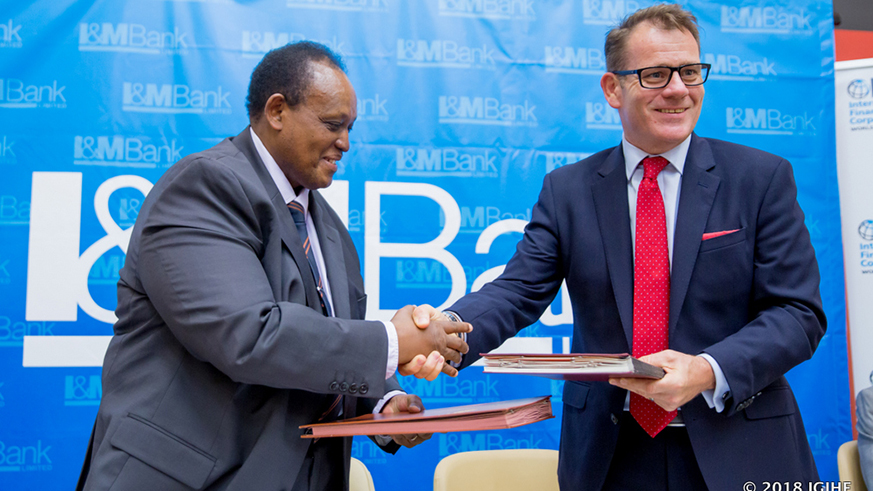 Robin Bairstow, Chief Executive Officer of I&M Bank Rwanda and Oumar Seydi, IFC Regional Director for Africa shake hands after the signing of the deal.