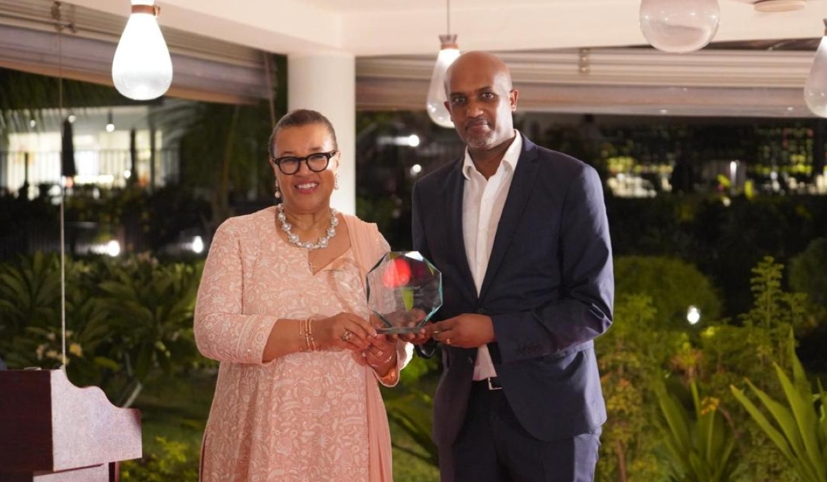 Commonwealth Secretary-General, Patricia Scotland KC hands over the award to Justice Minister Emmanuel Ugirashebuja during the 2024 Commonwealth Law Ministers Meeting in Zanzibar on Wednesday, March 7. Courtesy