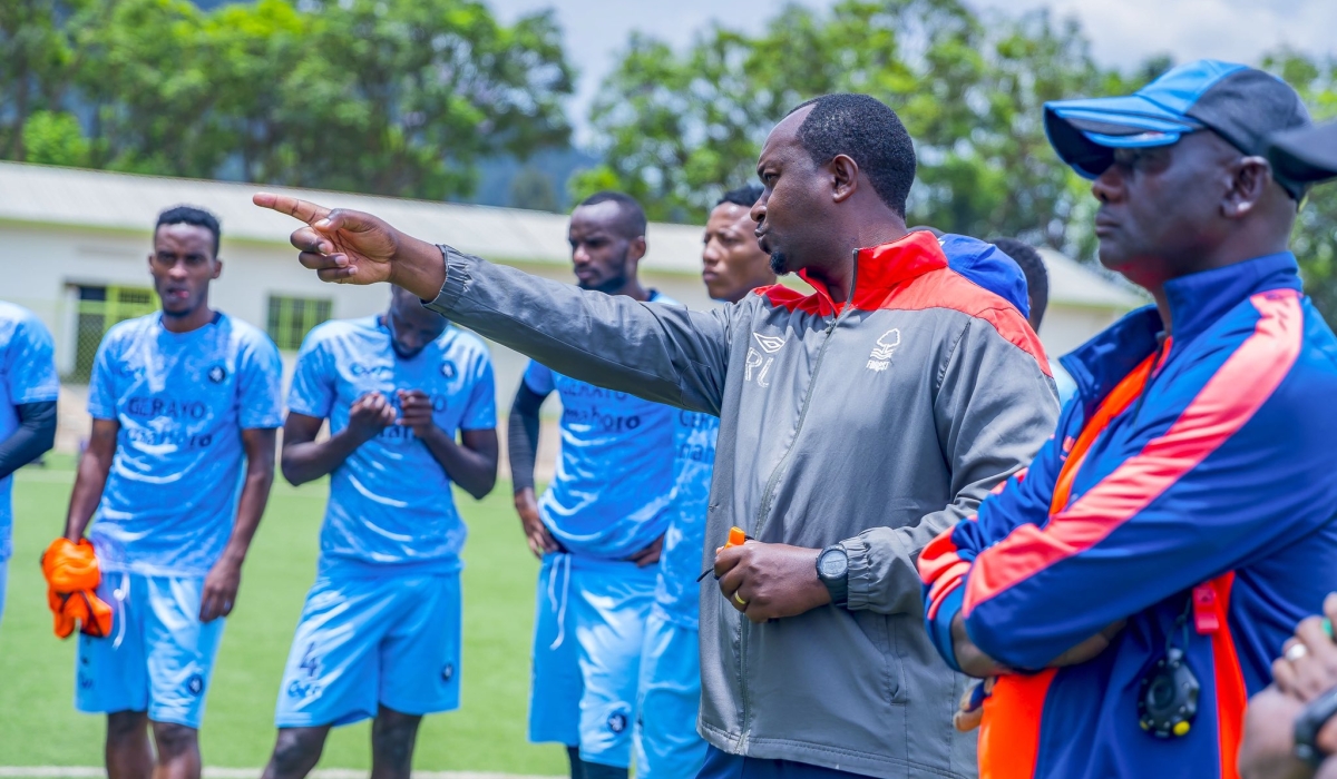 Police FC coach Vincent Mashami (center) talks to his players during a recent training session. The 40-year-old former Amavubi coach is under intense pressure after failing to pick up a win in the last three matches of the league season. Photo: Courtesy.