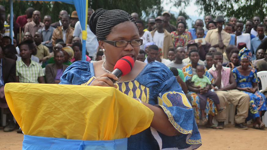 Minister for Disaster Management and Refugee Affairs Jeanne d’Arc de Bonheur speaks during the celebration of World Refugee Day at Nyabiheke Refugee Camp on Wednesday. The minister insists family planning and reproductive health education among the refugee community is a longlasting solution to early pregnancies emerging in the camp. Eddie Nsabimana.
