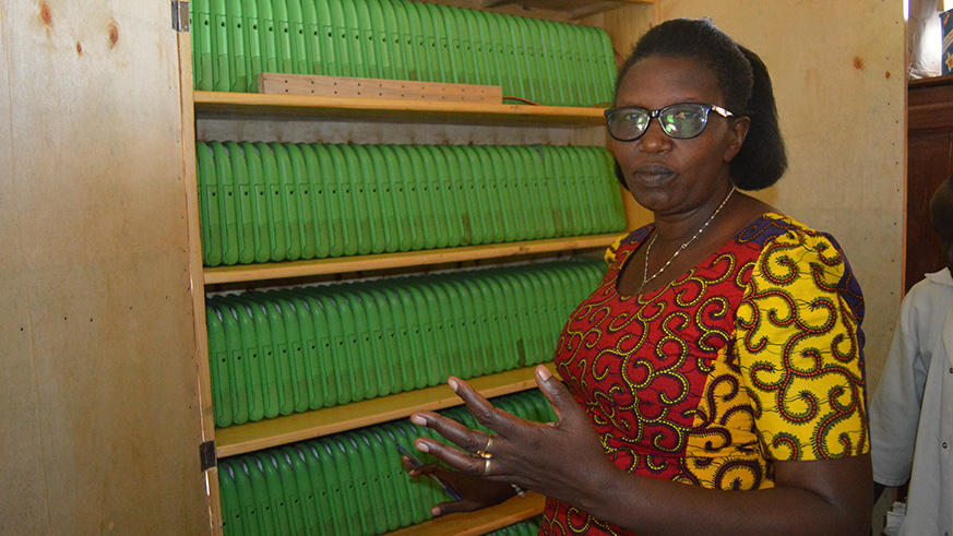 Jackqueline Mukangago the head mistress of E.P Kabuye showing the laptops that they now charge from school after they got connected to the national grid.