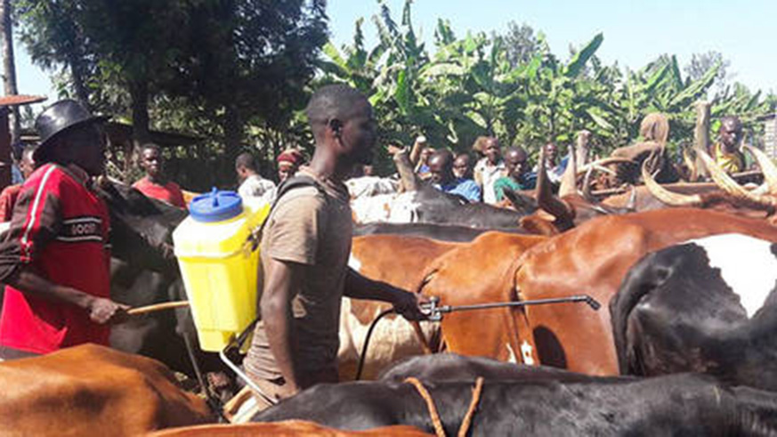 Farmers spray cows against Rift Valley Fever (RVF) in Eastern Province. The locally made drug, PermaPy Plus can tackle both ticks, and mosquitoes that cause. Emmanuel Ntirenganya.