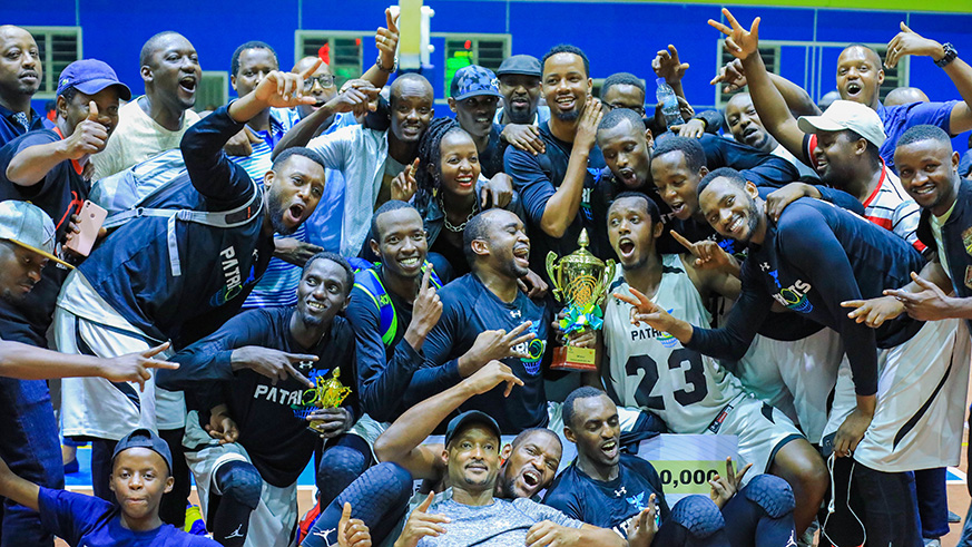 Patriots players joined by club officials and supports celebrate after beating rivals Rwanda Energy Group (REG) to retain the playoffs title at Amahoro Indoor Stadium on Friday night. Emmanuel Kwizera.