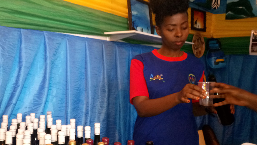 Assoumpta Uwamariya serving wine to a customer to sip during the Kigali the 2017 edition of International Trade Fair at Gikondo showground last year. / Emmanuel Ntirenganya