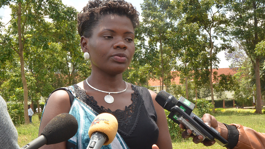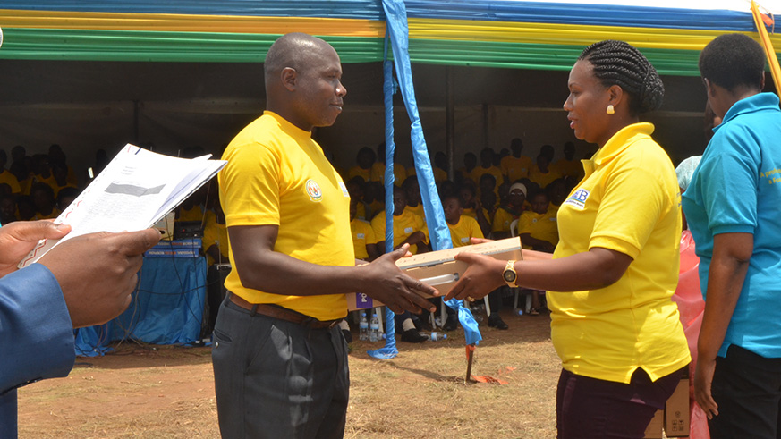 Aloysie Girabawe (2nd right), who emerged the best teacher nationwide in 2018, is awarded a motorbike, a flat screen TV and a laptop, as Education Minister Eugene Mutimura (right) and other officials congratulate her during the celebrations of the World Teachers’ Day in Rwamagana District yesterday. Jean de Dieu Nsabimana.