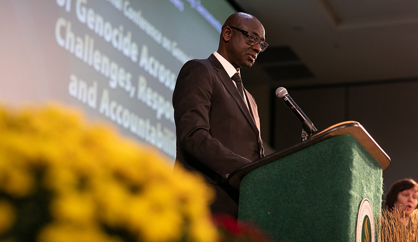Justice Minister and Attorney General Johnston Busingye on Thursday urged representatives of over 30 world universities and research institutions to provide their students with in-depth courses on the Genocide against the Tutsi. He was speaking from California State University in United States during an International Conference on Genocide. This, in addition to giving students the appropriate support to understand the 1994 Genocide, is important so that the younger generations have sufficient knowledge to understand what happened in Rwanda, with the goal of preventing other atrocities from occurring. The three-day conference has attracted over 500 people. Minister Busingye speaks from California State University in United States during an International Conference on Genocide. Busingye said: “We welcome the fact that courses on the Holocaust are taught in universities around the world; and this must continue for future generations.” “It is equally important that other internationally recognized genocides are taught globally, so that the younger generations have sufficient knowledge to understand what happened in 1994, with the goal of preventing other atrocities from occurring.” The Minister told those attending the conference that the National Commission for the Fighting against Genocide (CNLG) is ready to welcome researchers and support them in this regard. The conference, which is the fifth of this kind, is being held under the theme “Forms of Genocide Across the Globe: Challenges, Responses and Accountability.” “The conference is focussing on the collective memory of genocide including denial, impunity, arrests in aftermath, survivor testimony and prevention. The first international genocide conference to Sacramento State was initiated by Professor Alexandre Kimenyi in 1998,” Dr Jean-Damascène Bizimana, the CNLG Executive Secretary, told The New Times Friday. Kimenyi is a Rwanda-born US scholar who died in 2010. At the time of his death, he was a professor of Ethnic Studies at California State University, and organised the first of such meeting in 1998. Bizimana said: “For us in CNLG this [the conference] is a good way of informing people in international universities about the Genocide committed against the Tutsi, discussing and sharing ideas with researchers in America so that they know the truth and get encouraged to do more research and write about the Genocide against the Tutsi.” “CNLG has a partnership with four universities in the USA and we are looking to partner with other universities represented here in this international conference.” Officials from Rwanda attending the three-day international conference include representatives from the University of Rwanda (UR), CNLG, Imbuto Foundation, and private practitioners in law. On behalf of the Government of Rwanda, Busingye thanked the Ethnics Studies Department of California State University for organizing the conference in collaboration with CNLG. In about five months, he noted, Rwanda and the world will commemorate the 25 years since the Genocide perpetrated against the Tutsi. “This symposium is an opportunity for experienced as well as new researchers better understanding of this Genocide, and build up the store of knowledge on this issue.” On January 26, this year, the UN General Assembly adopted a resolution designating April 7 of each year as the International Day of Reflection on the Genocide perpetrated against the Tutsi in Rwanda, in 1994. This resolution modified another adopted on December 23, 2003, which, Busingye explained, created some confusion in its title because it spoke of “International Day of Reflection on the Genocide in Rwanda without naming which genocide it was. “There are no crimes without perpetrators and victims; it is therefore important when we talk about the gravity of genocide, to state the facts, to qualify for the honour of the victims, and also for the historical clarity.” He explained that all genocides come from an ideology of hatred, segregation, division, rejection of others and violence. “This is taught, disseminated and publicly inculcated with the intention of extermination of a particular group of people. It is this ideology that lawyers call the intention of committing genocide, that distinguishes genocide from other crimes against humanity.” This ideology of hate that precedes genocide, he said, is transmitted in advance to mobilise. And, he added, it is transmitted during the perpetration of the genocide to maximise participation in the killings and finally, it is transmitted after the perpetration of the genocide to deny the facts, distort its reality, denature its specificity, in order to discredit the honour and memory of victims and vindicate perpetrators.