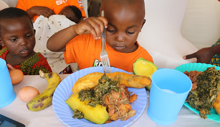 Cchildren feed on orange fleshed sweet potato during the CIP field visit in Musanze.