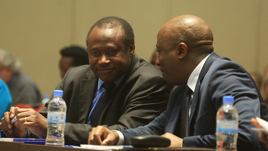 Edouard Ngirente consults with Minister Uzziel Ndagijimana during the official launch of the report (Sam Ngendahimana)