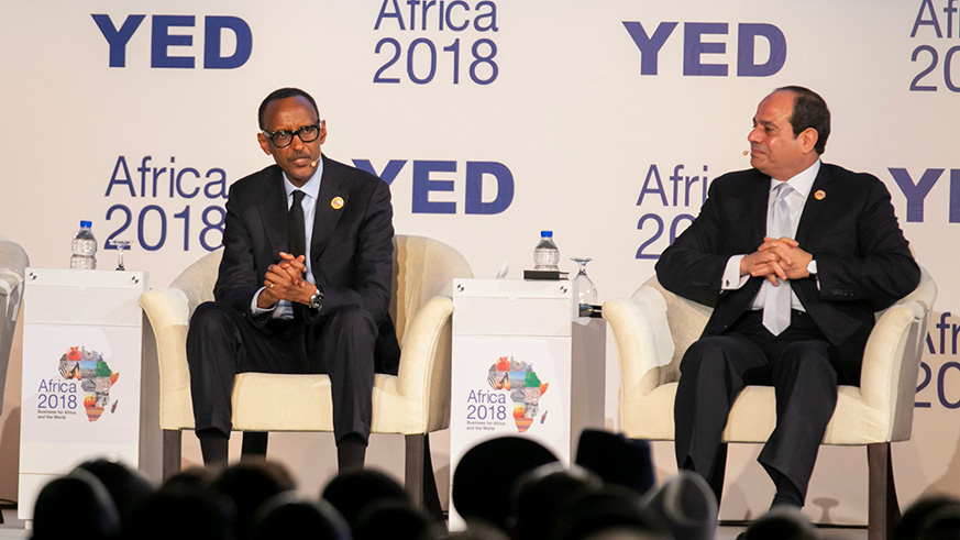 President Kagame speaks alongside President Abdel Fattah Al Sisi of the Arab Republic of Egypt at the on-going Africa 2018 Forum in Sharm El Sheikh, Egypt yesterday. Village Urugwiro.