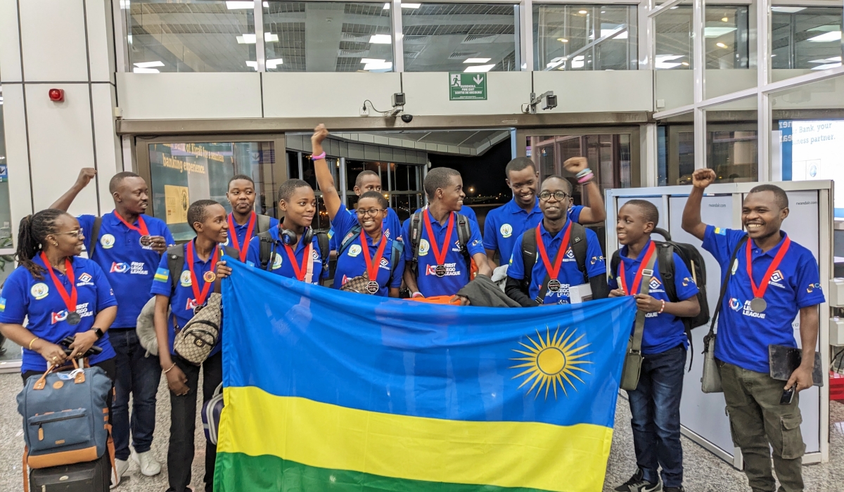 Students from Collège Christ-Roi de Nyanza arrive at Kigali International Airport from Texas, USA, on Monday, April 22, where they took part in the international First Lego League competition. Photo by Frank Ntarindwa