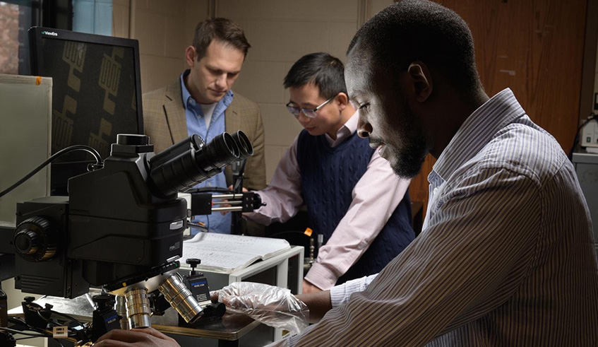 Most electronics, worldwide, only function within a certain temperature range. However, researchers at Purdue University, a public research university in Indiana, US, are working on a new app that can withstand extreme heat. Rwandan researcher Aristide Gumyusenge is the lead author of the paper and graduate researcher at the same university. Along with his colleagues and led by Prof. Jianguo Mei, they have discovered polymers that can sustain extreme heat, higher than 220 Celsius. Their discovery was published in one of the most prestigious US journals called Science Magazine. The weekly magazine was first published in 1880 and has a print subscriber base of around 130,000. With this invention, companies like Samsung that have endured substantial losses due to overheating in circuits might be in luck. The researchers also believe that this discovery will allow the fabrication of lightweight electronics usable in aircrafts, car engines, and other applications that require extreme thermal stability. “Being part of a groundbreaking research, it would be an honor to be able to bring it to Rwanda. I am aware that we might not have the high-tech instruments to conduct such research, but I know we have big dreams and I am not afraid to dream with my home country,” exclaimed Gumyusenge when asked about his innovation. Aristide Gumyusenge is currently pursuing a PhD in Organic Chemistry in the US. Fruits hard work The 27-year-old is one of the Rwandan presidential scholars, class of 2010, pursuing a PhD degree in materials chemistry. Born on a small farm in Kamonyi District, Southern Province, Gumyusenge’s family survived the 1994 Genocide against the Tutsi. Against all odds, he was a straight A student right from primary level. He joined Petit Seminaire St Leon for high school where he majored in Chemistry, Biology, and Mathematics and scored distinctions in all subjects in the national exams at the end of high school in 2010. He especially scored the second best scores in chemistry that earned the Rwandan Presidential Scholarship to attend university in the USA. “Winning the presidential scholarship was one of the best things that ever happened to me. I remember working so hard and studying every day for the national exams. At Petit Seminaire St Leon, it was a tradition that the first in the class gets the scholarship. I was so excited, and I started learning spoken English right after the exams. It was an amazing accomplishment and I was very thankful for the Rwandan government for having provided such an opportunity for me and others,” Gumyusenge recalls. He reveals that he taught himself how to speak English by listening to BBC and VOA stations and as a result, passed the interview as part of the 18 presidential scholars that were received by Hendrix Consortium. He then attended Wofford College in South Carolina and majored in chemistry with a minor in mathematics. Finding the academic part of the college not too challenging, Aristide acquired a job as a librarian in order to financially support his sister and brother, to go through nursing school and civil engineering school, respectively. “It was difficult at times,” he narrates, “but I always tried to approach life selflessly and kept my five siblings in mind after I had left Rwanda. While in college I had two jobs and would send the paycheck to them, while I used the scholarship money to buy whatever I needed.” He continues: “I shared the little I had with my family, and I plan to keep it that way. It does come with a few sacrifices, for example, I have not been home since 2013. It’s always sad when I have to tell my mom that I won’t book any flight ticket until my younger brother’s tuition is covered, but it is okay. I know she understands that and I know she’s happy for me.” As a college student, Gumyusenge was able to quickly integrate into the American culture, thanks to his host family, in Spartanburg SC. As a junior he did a summer research at the Center of Sustainable Materials Chemistry in Oregon, inspired by the work of the late American Scientist Linus Pauling. He then decided to join Purdue University to pursue his PhD degree in organic chemistry, with a focus in materials chemistry. He joined the research team led by Prof. Jianguo Mei because he believes nano-materials hold significance in developing novel technologies. Aristide aims to continue doing scientific research in materials chemistry. “I am not sure if it’s merely passion for chemistry,” he says, “I think it was something that my mother always taught me: no matter what it is that you do, work hard and you will be rewarded no matter who gets the credit.” “So chemistry being the easiest subject for me, I chose it and just concentrated on learning it, while also looking into how we can use science to make a difference. I think chemistry is a powerful tool that can impact people’s lives from medicine, technology, to sustainability; I always get motivated when it comes to making people’s lives better,” he adds. Gumyusenge and his research team discovered a new electronic that can withstand extreme temperature. Courtesy photos About his research “My current research,” Gumyusenge explains, “is looking into enabling technological advancement in fields that can revolutionise humankind, so it is a great honor to be part of it. I do believe it will eventually have an impact on my home country and it really keeps me motivated to think that my research work will one day be useful.” In their research work, the group uses rigid polymers analogous like those used by NASA for the space capsules insulation. The researchers can form semiconducting nanocomposites that are thermally robust. Their electronics are functional from room temperature up to 250 °C. Usually, the performance of electronics depends on temperature and the performance of these new polymer blend remains stable across a wide temperature range. The most impressi