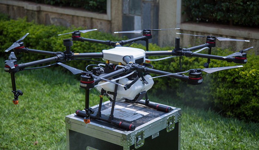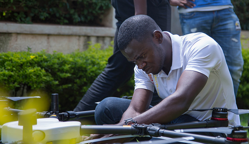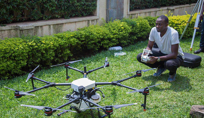 Teddy Segore, one of the pilots with Charis test-flies one of the drones to be deployed in the spraying of larvicide that will target mosquito-prone areas across the country to curtail malaria spread. Nadege Imbabazi.