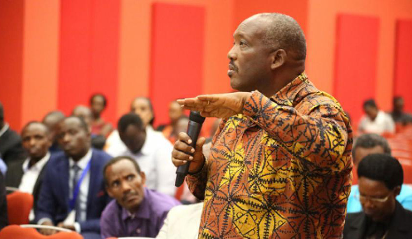 Prof. Jean Pierre Dusingizemungu, the president of Ibuka, the umbrella of Genocide survivors’ associations, speaks at a memorial event in honour of wiped out families in May last year in Kigali. File.