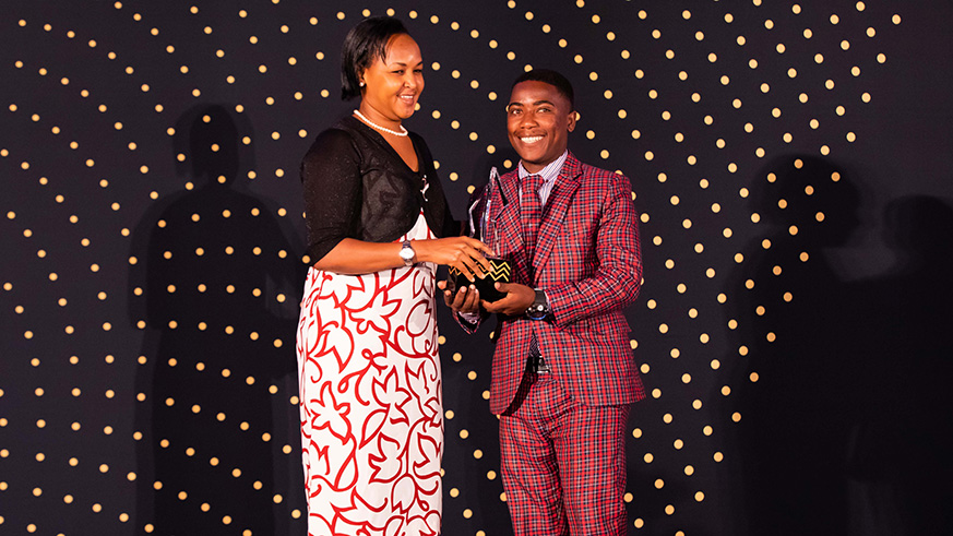 Jean Marie Vianney Habiyaremye, (R) the 2018 RDB Business Excellence Awards Young Entrepreneur of the Year receives his award from Minister for Youth Rosemary Mbabazi. Emmanuel Kwizera.