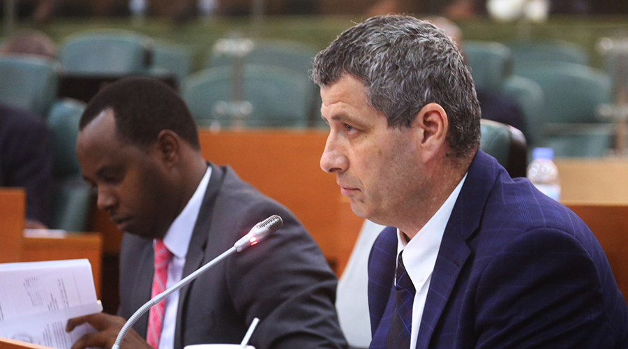 Rwanda Energy Group Chief Executive Officer Ron Weiss addresses senators during the meeting yesterday. He is being flanked by Robert Nyamvumba, the Acting Board Chairman of the utility body. / Sam Ngendahimana