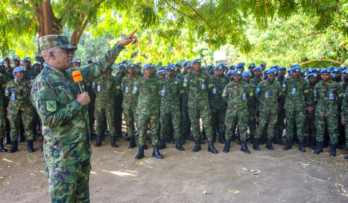 Rwanda Defence Force (RDF) Army Chief of Staff (ACOS), Maj Gen Vincent Nyakarundi, interacts with Rwandan peacekeepers at the UN Thongping Base Camp in Juba, South Sudan, on Tuesday, April 30.