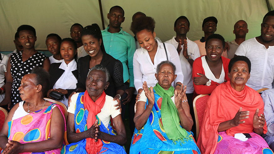 Some of the elderly genocide survivors whose families were completely wiped out in the Genocide against the Tutsi with youth in Nyanza District yesterday. Sam Ngendahimana.