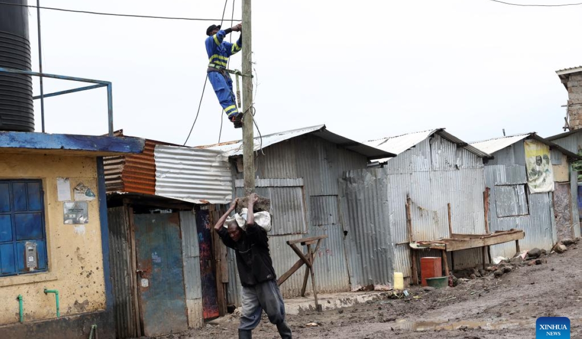 An engineer works on a power line pole in Nairobi, Kenya, May 6, 2024. UN humanitarians said on Monday nearly 750,000 people were affected by flooding in eastern Africa, with 234,000 displaced and more than 236 killed - more than 229 in Kenya alone.