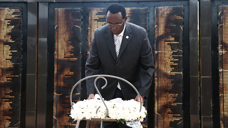 President of the Senate Bernard Makuza lays a wreath at Rebero Genocide Memorial on Saturday. Over 14,000 Genocide victims, including 12 politicians, are buried at the memorial site. Sam Ngendahimana.