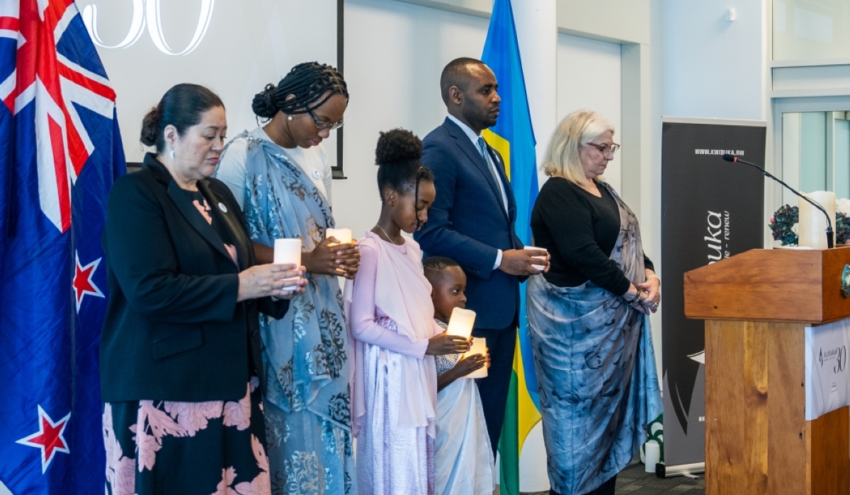 Rwanda’s High Commissioner to New Zealand, Jean de Dieu Uwihanganye ( 2nd R) with other mourners, observe a moment of silence in honour of the victims during the commemoration event in Auckland, New Zealand on April 20,2024. Courtesy